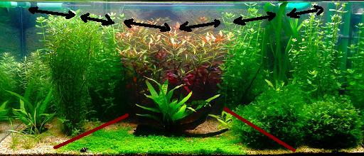 La tecnica es podar por donde señalan las flechas negras para asi lograr dar al acuario un paisaje mas bonito y darle profundidad.
